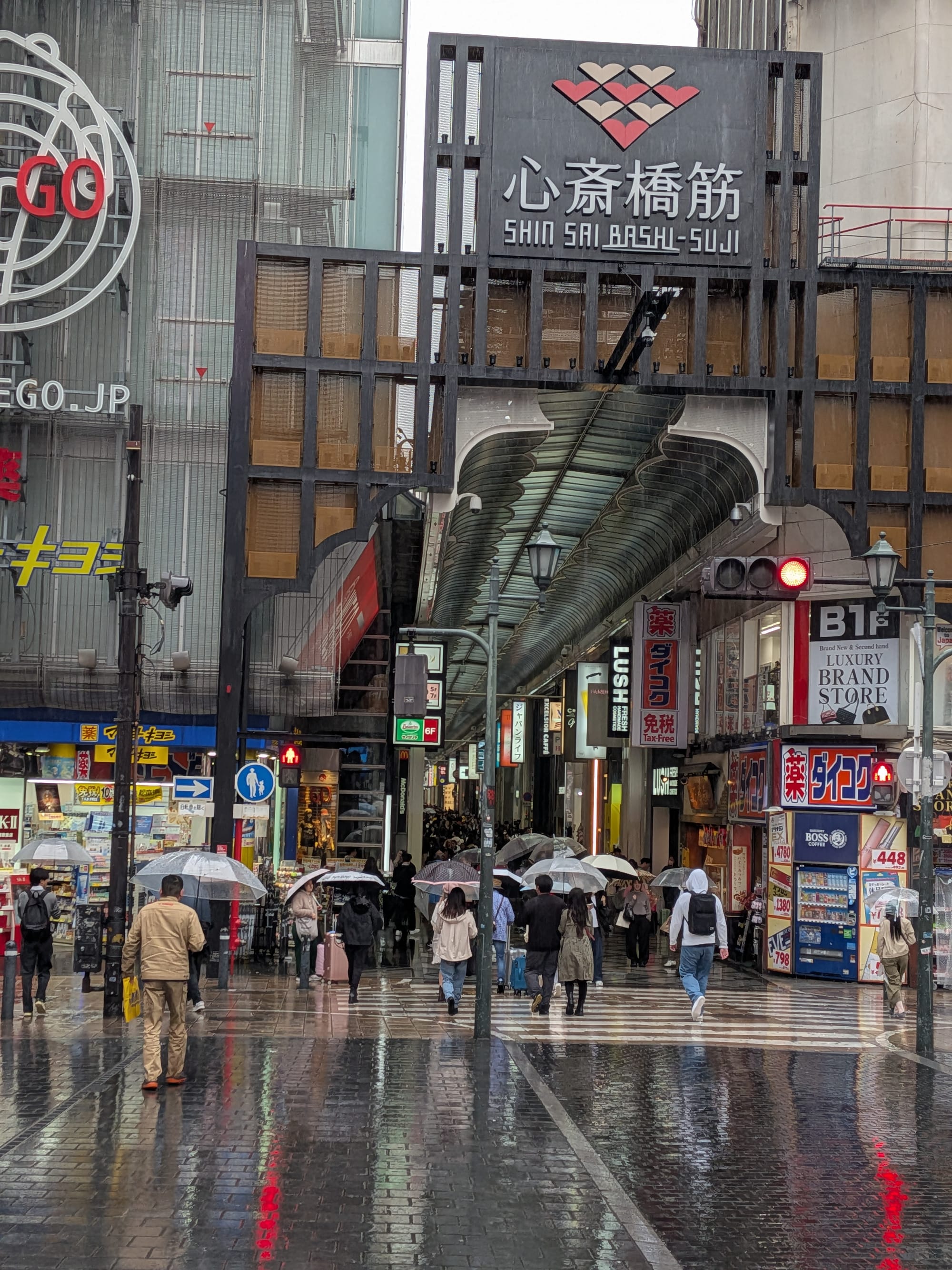 Kurzgefasst, der Andrang in der Ebisu Bashi Suji und der Shin Sai Bashi Suji Passage ist auch bei diesem Sauwetter enorm. Das mag daran liegen, dass die Passage, mit Ausnahme von ein paar Kreuzungen, überdacht ist.