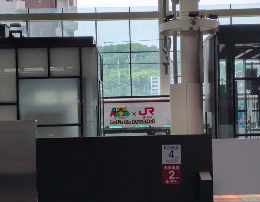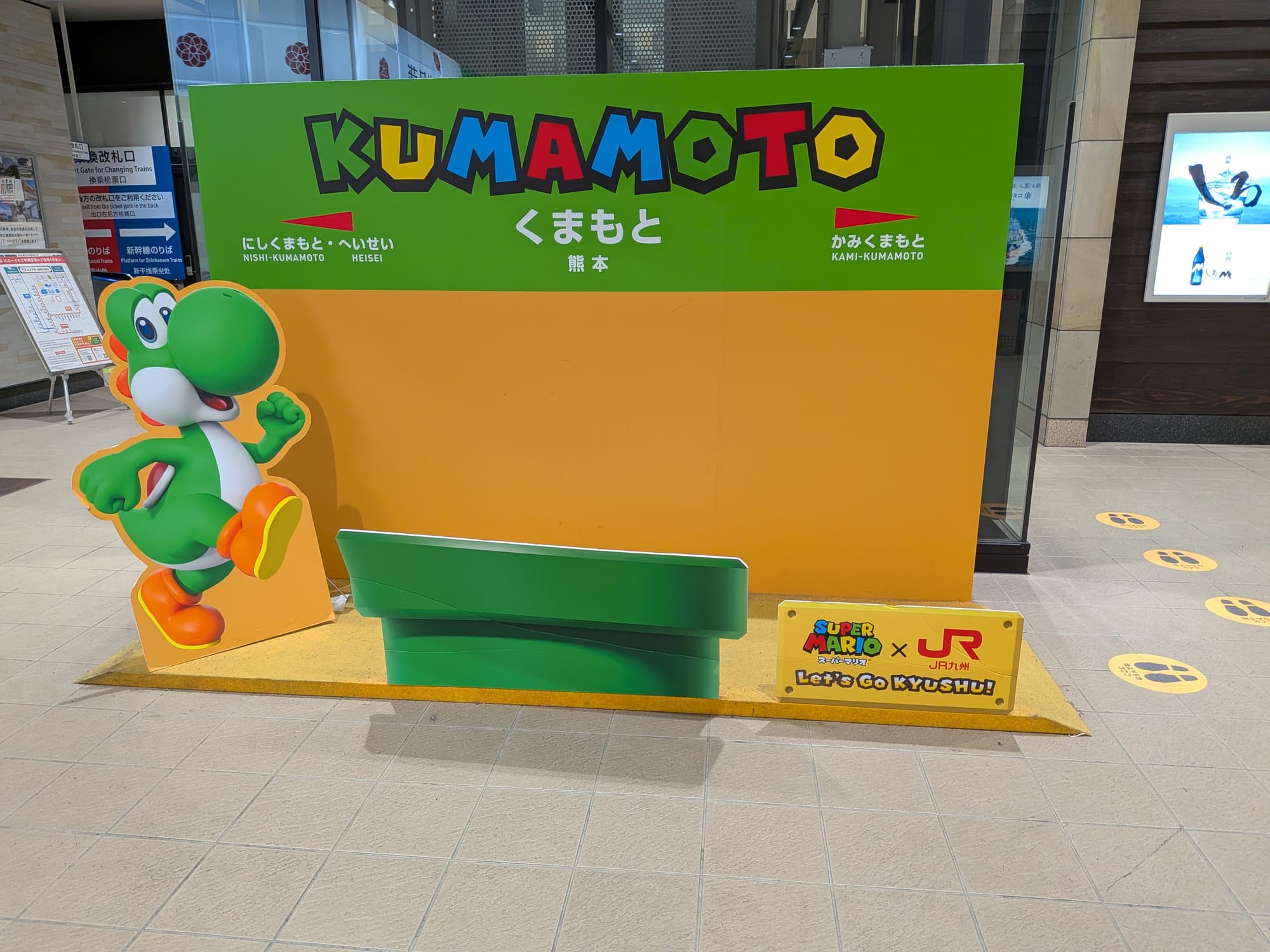 JR Kyushu und Nintendo haben gerade eine Partnerschaft. Ein paar Züge auf unterschiedlichen Strecken tragen Super Mario Lackierungen. Ich konnte bisher noch mit keinem davor fahren aber in Kumamoto, auf dem übernächsten Gleis fur dieser Schinkansen vorbei.