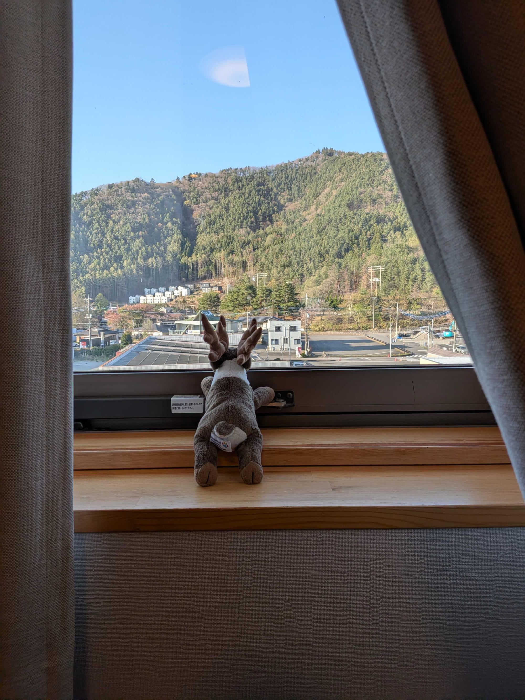 Poe, falsche Seite, der Berg auf der anderen Seite des Gebäudes! Ich zahl nicht 20 Euro für die Nacht extra nur um Blick auf Mount Fuji und die Bahnlinie zu haben, die uns hergebracht hat.